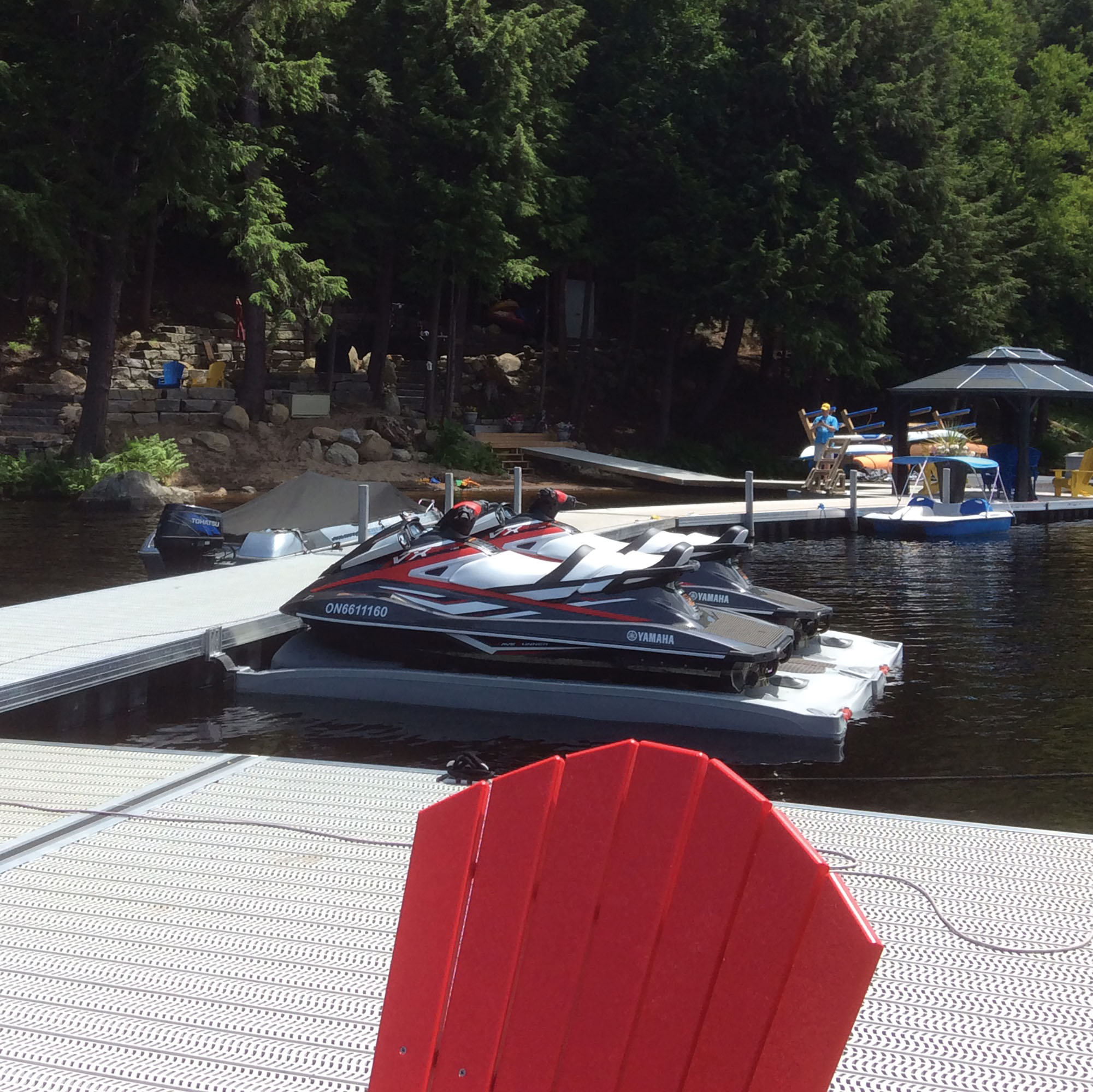 A unique characteristic of the DockinaPort® is that it is possible to adjust the floating height in the water specific to your individual needs. There are 6 strategically built independent buoyancy chambers located underneath the port. Two in the middle, two forward and two rear. These chambers have the ability to release or hold trapped air underneath the port. Removal of the air valve screw (and leaving it out) allows the trapped air to vent straight through to the atmosphere (this vent does not let the air within the DockinaPort® escape, just what is underneath). Because all PWC’s are not the same, these chambers give you the ability to adjust the attitude of the port in multiple ways. For example, if you have one of the newer heavier machines (800 to1000 lbs.) you can leave all the air valve screws closed in the 6 chambers and the height sits just right in the water. If you change watercraft or want to put one of the lighter 500lb PWC’s on the port, you can take out (remove) the valve from one or all 6 of the chambers and lower the entire port down in the water level (or only lower the section you want). Each of these chambers holds approximately 50 lbs. of trapped air. By removing the air valve screws it is possible to drop the buoyancy in that area, effectively lowering, tilting or custom adjusting the angle to your liking or needs. If you find you would like the watercraft to slide off the port more easily you would take out the air valve screw at each side of the rear allowing the port to sit lower in the water at the back. Putting the air back is just a simple matter of sliding the watercraft off the port applying some silicone or caulking on the threads of the air valve screws and, inserting it back in the hole.